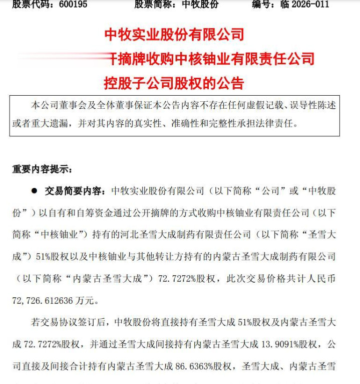 中牧股份(600195.SH)公告称,公司拟以7.27亿元收购中核铀业捏有的河北圣雪大成制药有限株连公司(以下简称“圣雪大成”)51%股权及中核铀业与其他公司捏有的内蒙古圣雪大成制药有限公司(以下简称“内蒙古圣雪大成”)72.7272%股权。收购完成后,圣雪大成、内蒙古圣雪大成将成为中牧股份控股子公司,其财务数据将纳入公司团结财务报表畛域。